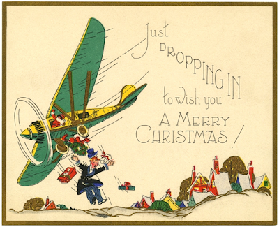 Old-fashioned Christmas greetings featuring Santa Claus traveling by train, motorcycle, antique automobiles and even spaceships.